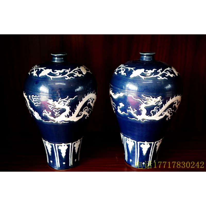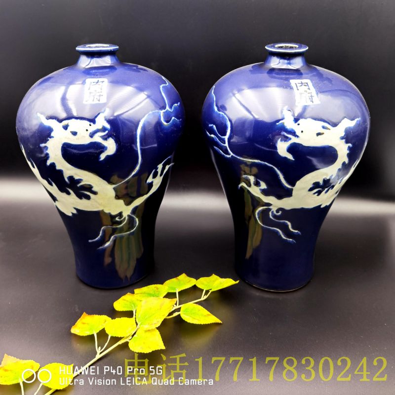 内府蓝釉留白云龙纹梅瓶一对