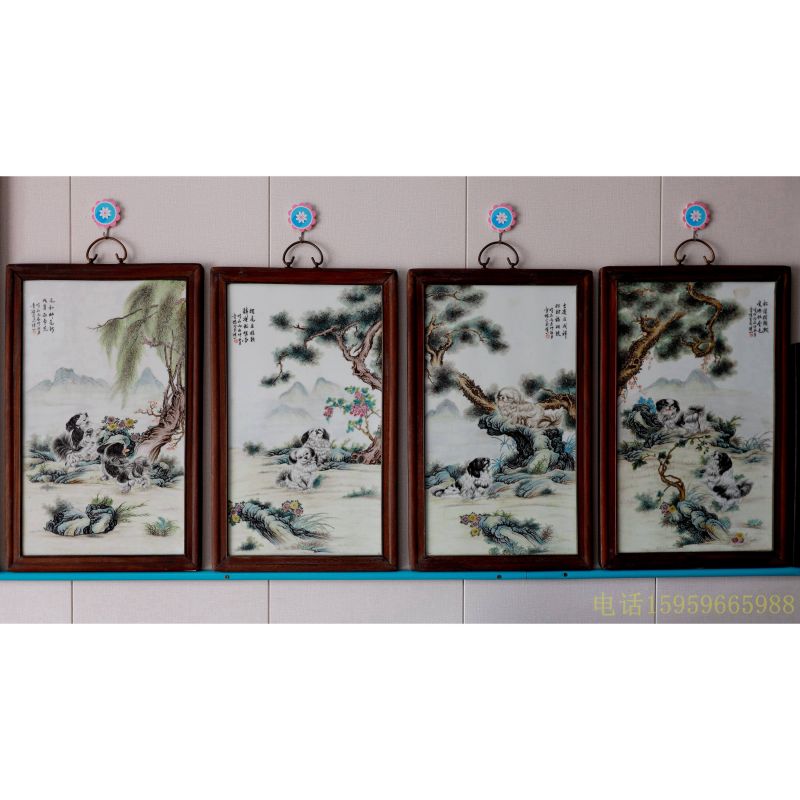 中国陶瓷美术大师,景德镇陶瓷研究所美研室主任章鉴“瑞狗呈详”四挂瓶瓷板画