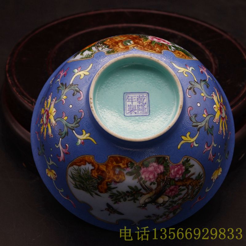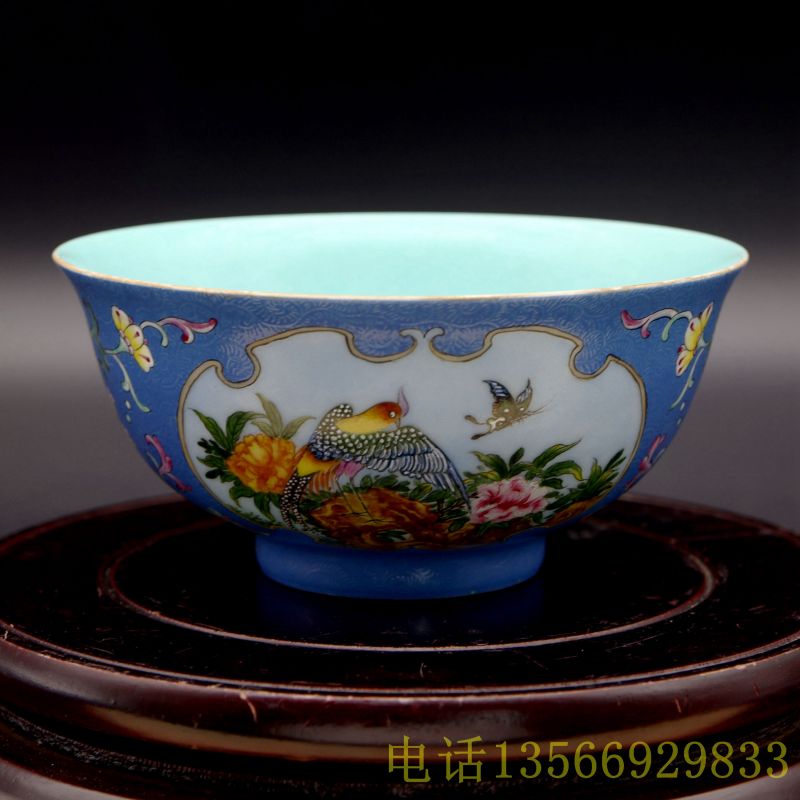 珐琅彩蓝底轧道开光花鸟纹碗