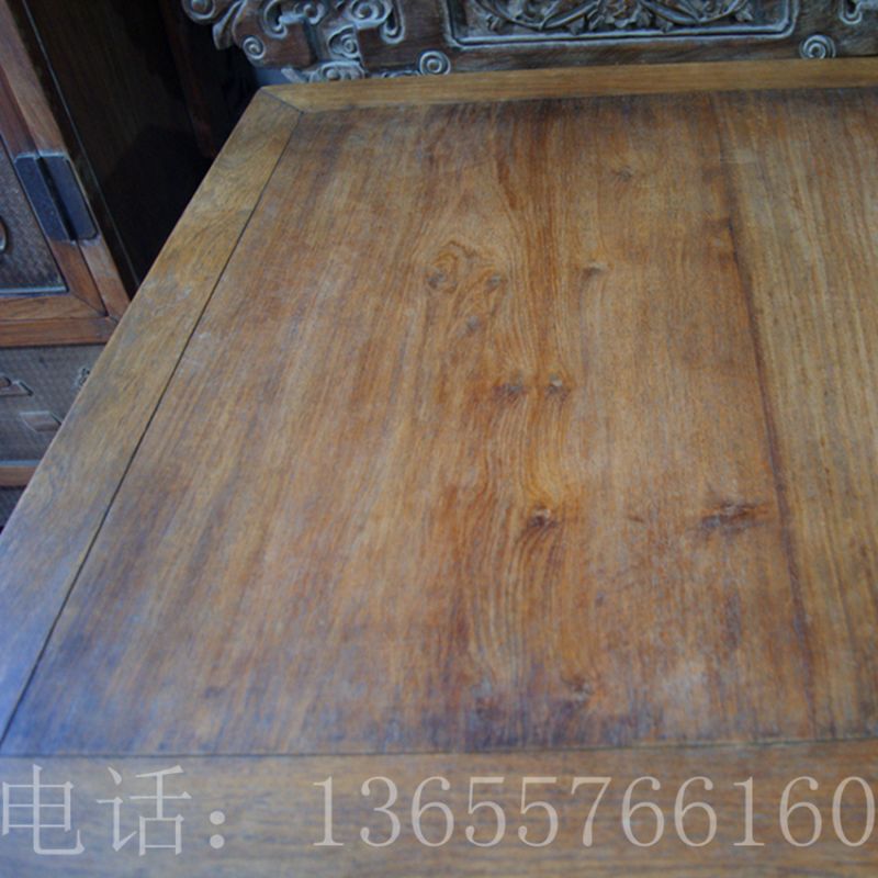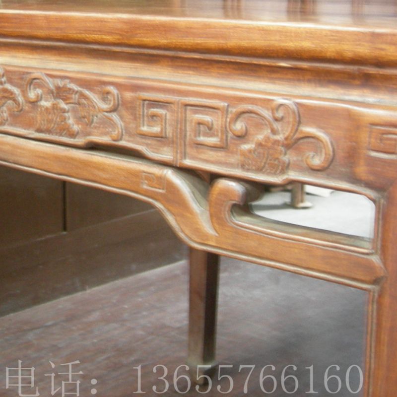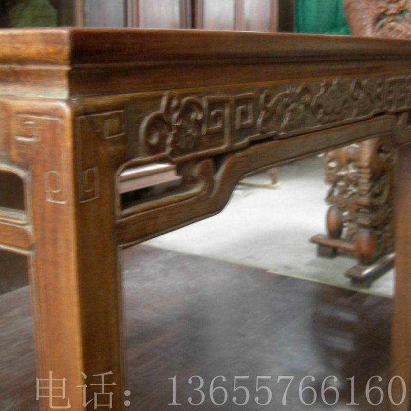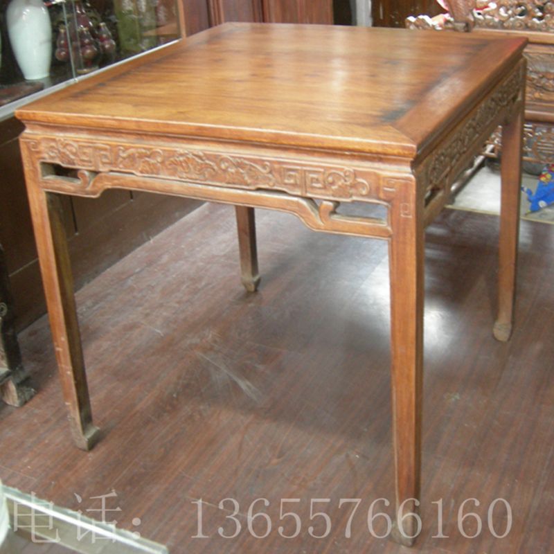通体为黄花黎木制作,高约0.84米,宽约0.94米,桌面由大幅面板两拼而成。其中一幅尤为宽大,非近万年老树不可得,因此极其珍贵。面下带束腰,安直牙条,雕卷草纹.回纹。四腿间安罗锅帐,上端与牙条相抵,沿罗锅帐及腿部马蹄内缘起压边条。方腿直足,内翻马蹄形。与现今尚保存北京故宫博物院的一件方桌为同块材料裁制,而且规格和花式都一样,可见是同工匠,同时期作品。(详见《故宫收藏 你应该知道的131件黄花黎家具》第86页)