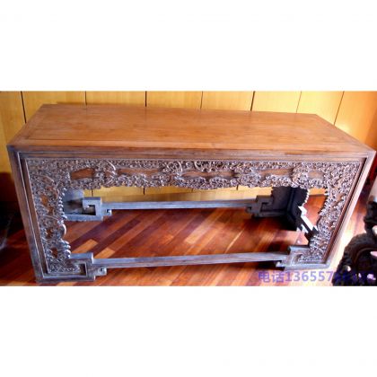 此案高约0.89米,长约1.91米,宽约0.69米;通体为海南黄花黎榫桙结构,案面由两张大面幅木板拼构而成,平整光滑;侧面雕刻严锦云纹图,附精细灵动的蝙蝠36只,取36天罡之数,而蝙蝠的“蝠”通“福”,从明代开始就有幸福美满的意思;“云”,“蝠”相合正好寓意着“洪福齐天”;案桌底部的踏脚,平直高悬,取踏天桥,平步青云之意,既能使结构坚固,又能让君有种云端作画,指点江山般的惬意。