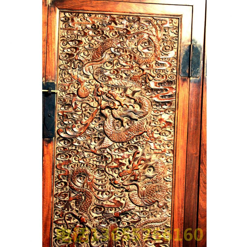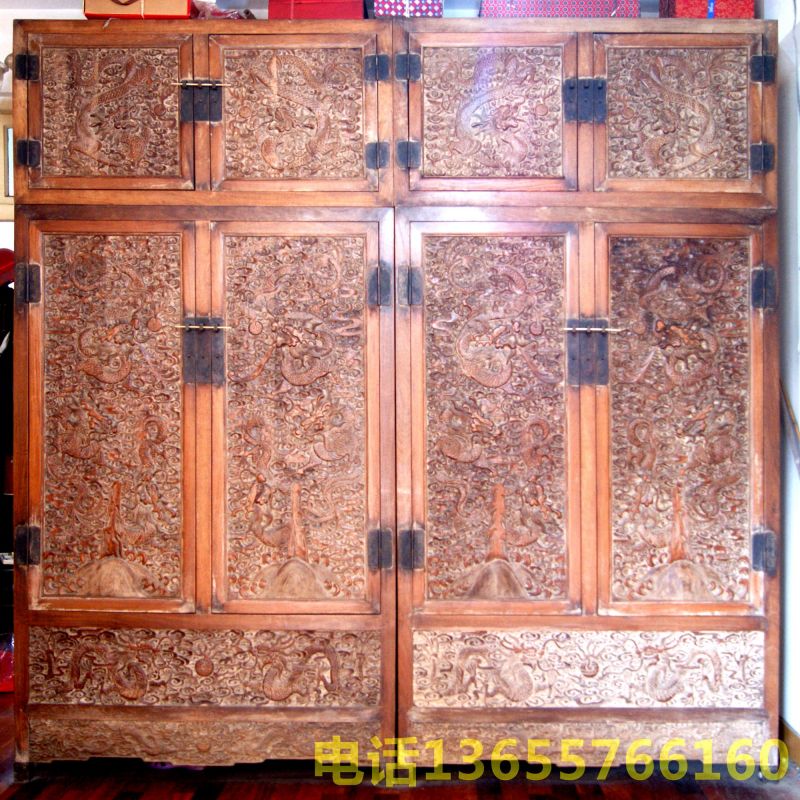 清代海南黄花黎雕云龙纹顶箱柜 整体高约2.4米,宽约2.4米,深约0.55米,结构端正,规格严谨。正面雕刻了24条活灵活现的神龙,结合黄花黎固有的纹色,构成了黄龙狂舞,天威浩荡的磅礴气象。 据悉,此柜为清中期宫廷内务府造办处所制,曾立于乾清宫,受百官朝拜,标显皇家威武宏伟,正大光明的气派。清嘉庆18年,天理教造反,教民攻入紫禁城,红花会(今洪门及致公党)潜伏在清宫的干部(一位王姓的太监总管)把嘉庆皇帝诓骗到西山(今北京香山)行宫,然后将宫廷珍藏一股脑的带出禁城。