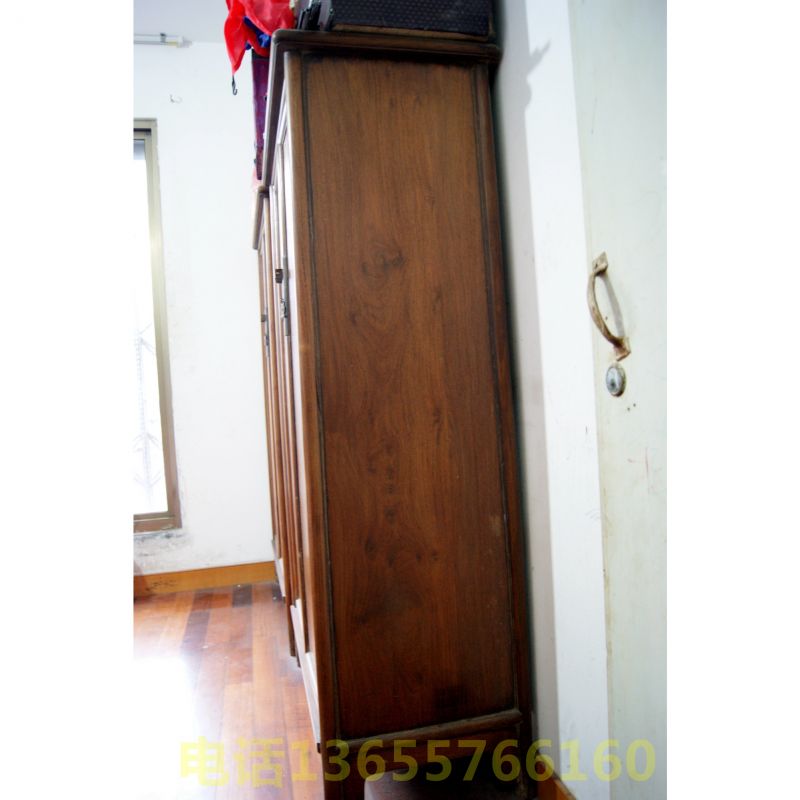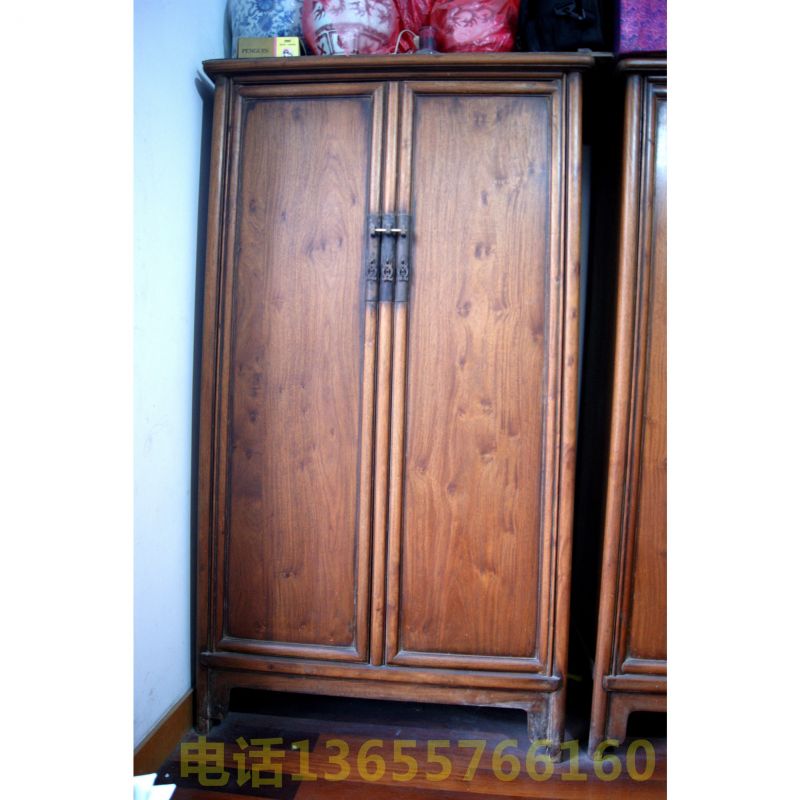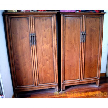 明代海南黄花黎面条柜一对 单件高约1.65米,宽约0.90米,深约0.46米,以榫桙结构,上窄下宽。柜面平整光滑,木质纹理清晰,纤维细腻,表面布满狸面鬼脸,无任何雕饰,却显得古朴大方。