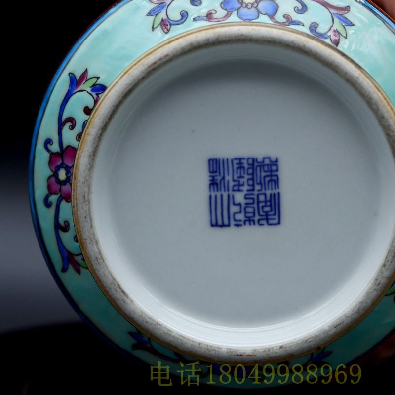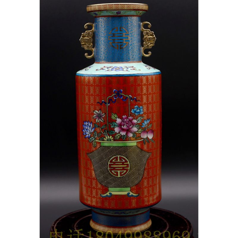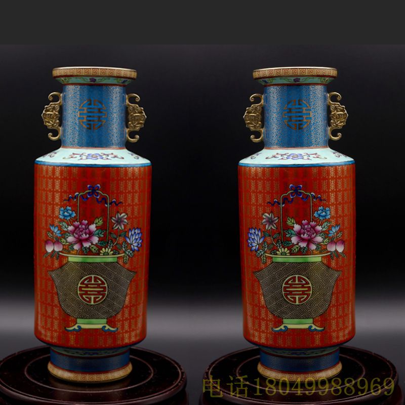 红彩珐琅彩万寿双耳棒槌瓶一对