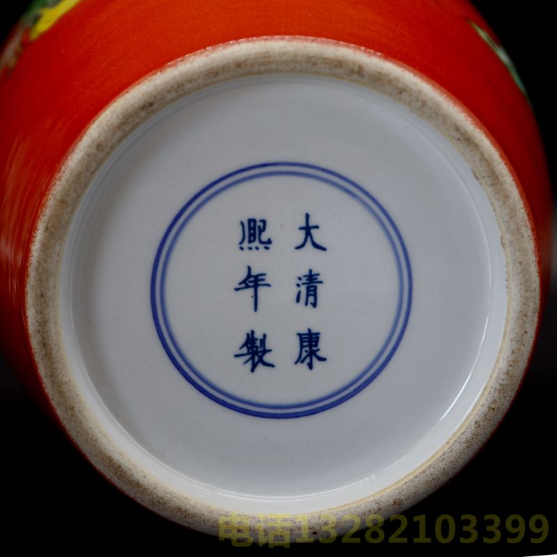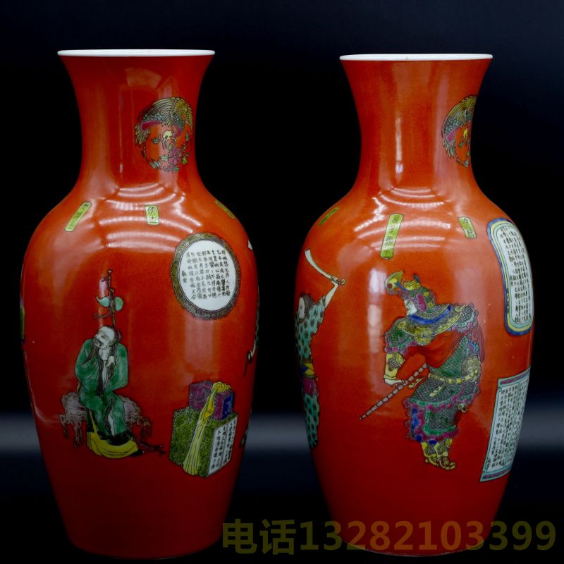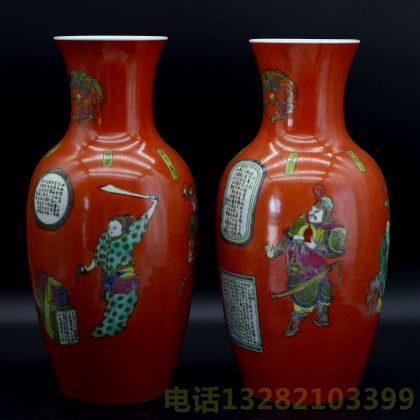 大清康熙年制款矾红粉彩刀马诗文赏瓶一对