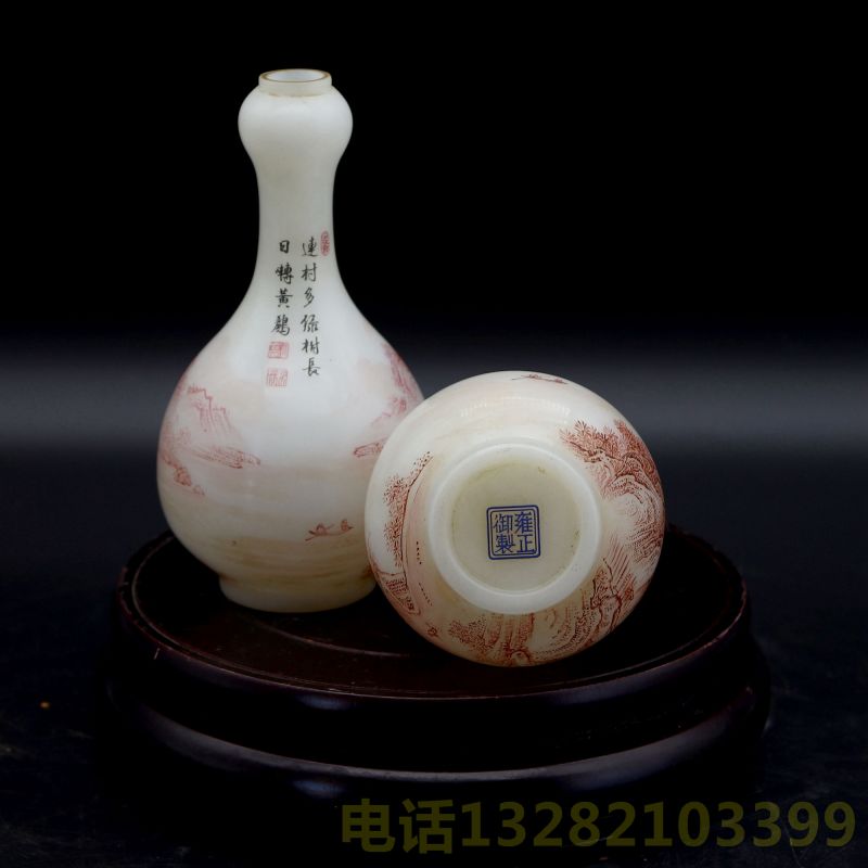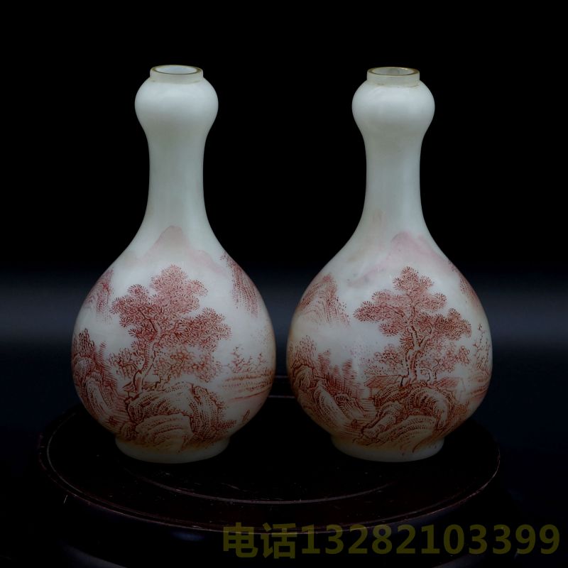 雍正年制珐琅款胭脂红山水诗文蒜头瓶一对