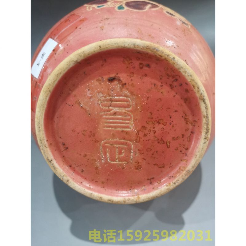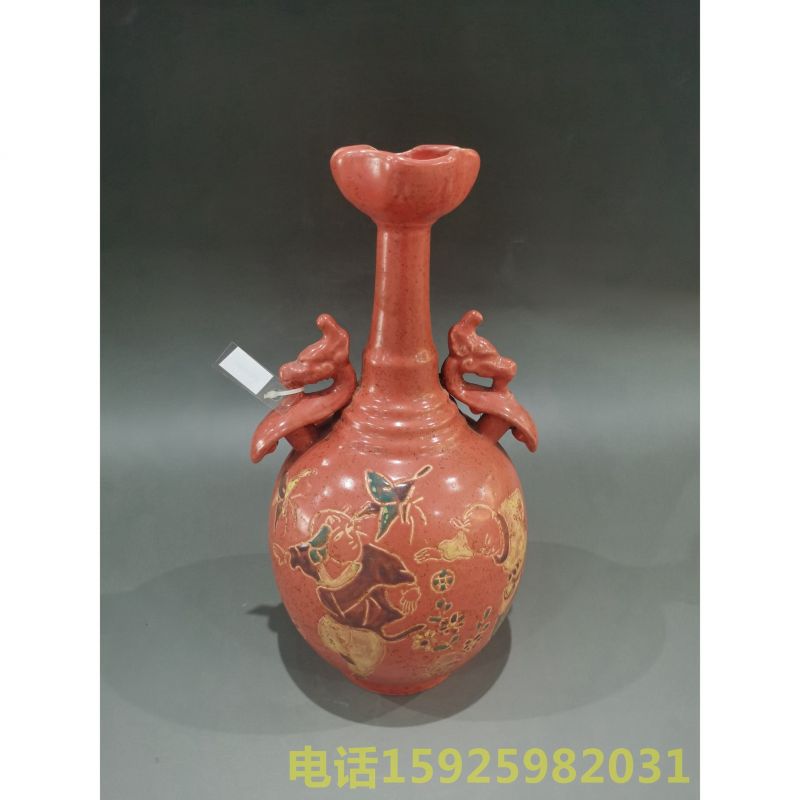 定窑红釉婴戏纹双耳花口瓶