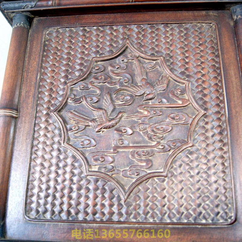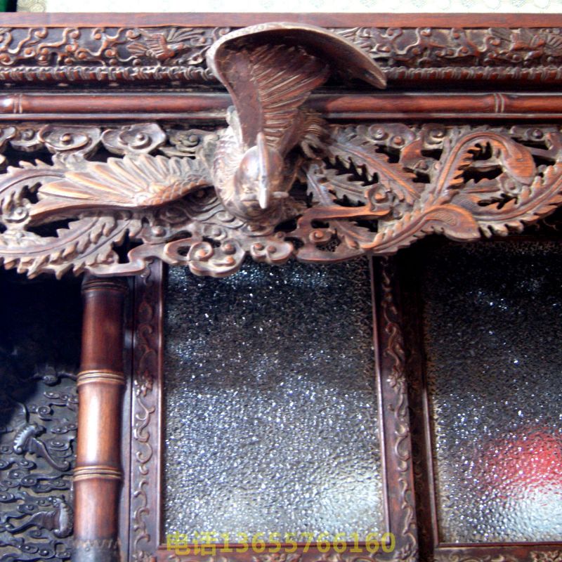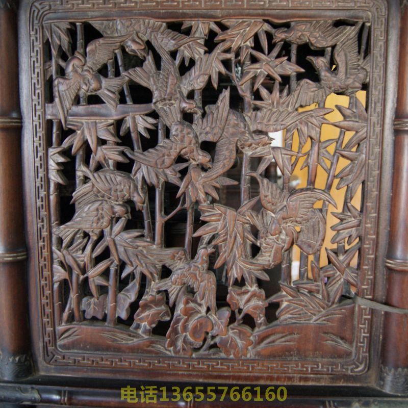 高2.1米,宽1.55米,厚约0.63米,通体为黄花黎嵌琉璃片,采用榫桙.包铜皮.生物胶粘合等方式结构而成.雕有各种灵禽108只,取"百年朝凤"之意,又暗符一百零八星宿之数,平台楼阁悬空布局,再附上镂空帷帐,上面云雀齐舞,让君仿佛身处高台云雾之中,倾听凤鸣鹤啼之乐.