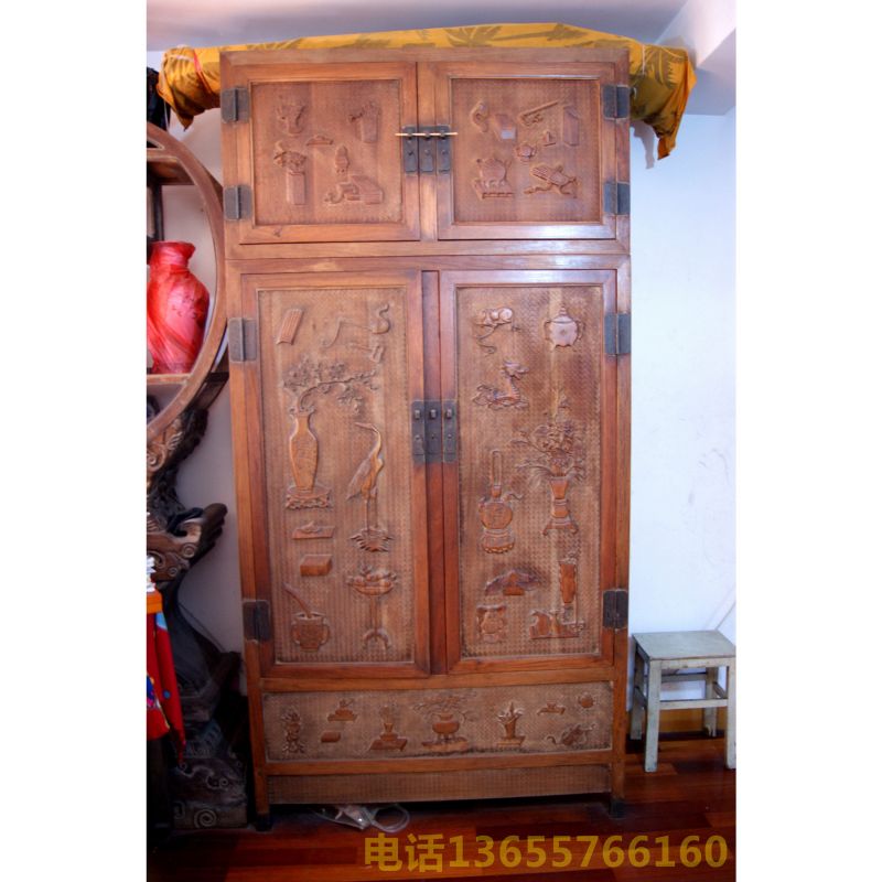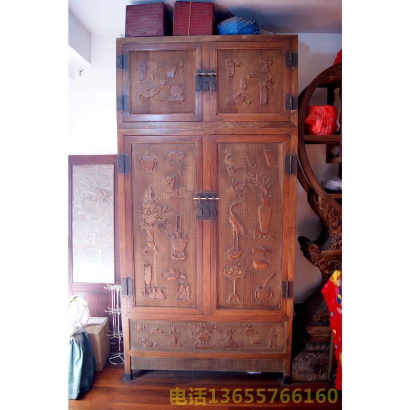 清代海南黄花黎“卐”字锦地博古图顶箱柜 整体高约2.4米,宽约2.4米,深约0.55米。系颐和园万方安和殿内的一件陈列品。因清皇朝信奉佛教,整个宫殿均以“卐”字为地,附其他花饰的雕刻格式布置,而博古图则能够在整体繁华的格局中体现古朴大方的氛围,正是陈列器中的精品。清嘉庆18年,天理教造反,教民攻入紫禁城,红花会(今洪门及致公党)潜伏在清宫的干部(一位王姓的太监总管)把嘉庆皇帝诓骗到西山(今北京香山)行宫,然后将宫廷珍藏一股脑的带出禁城。