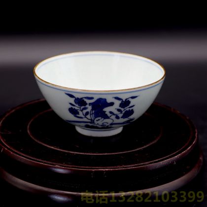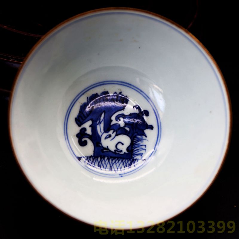 清富贵佳器款青花山石玉兔宫碗