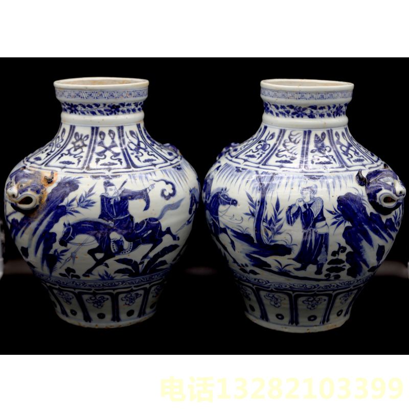 元青花刀马辅兽耳罐一对