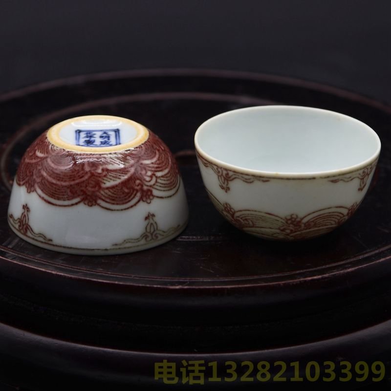 大明成化年制青花六字款釉里红海水纹卧足杯一对