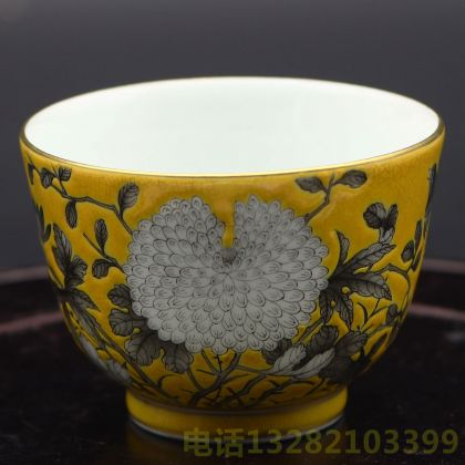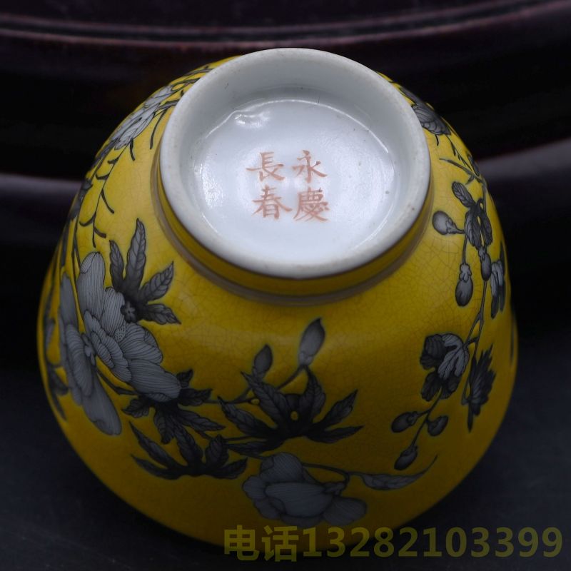 永庆长春矾红款黄地墨彩描金花卉纹杯