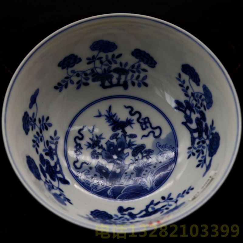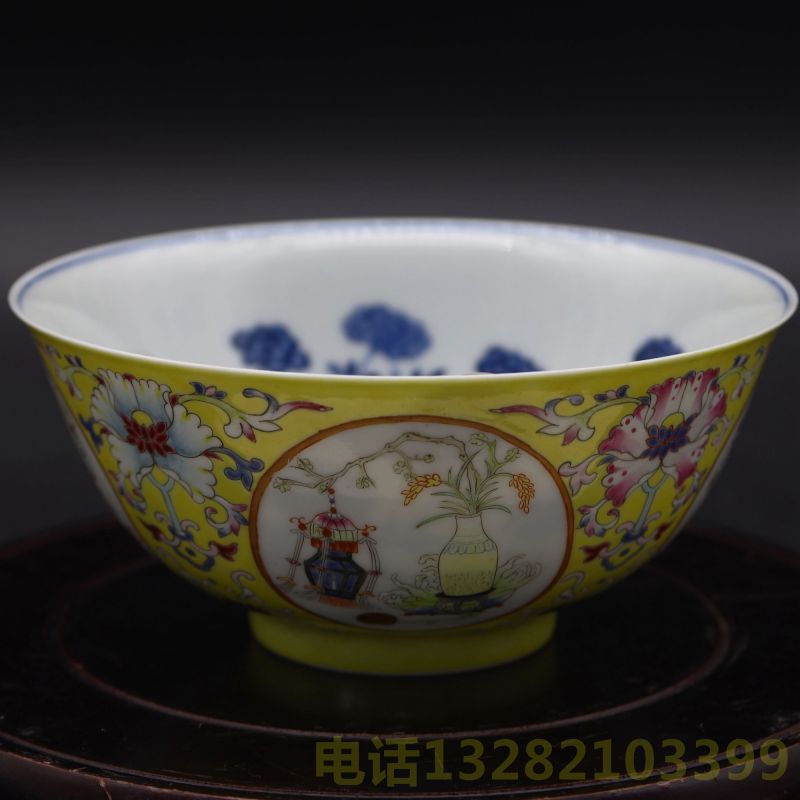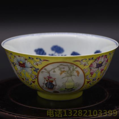 大清道光年制六字款官窑粉彩描金内青花灵芝纹宫碗