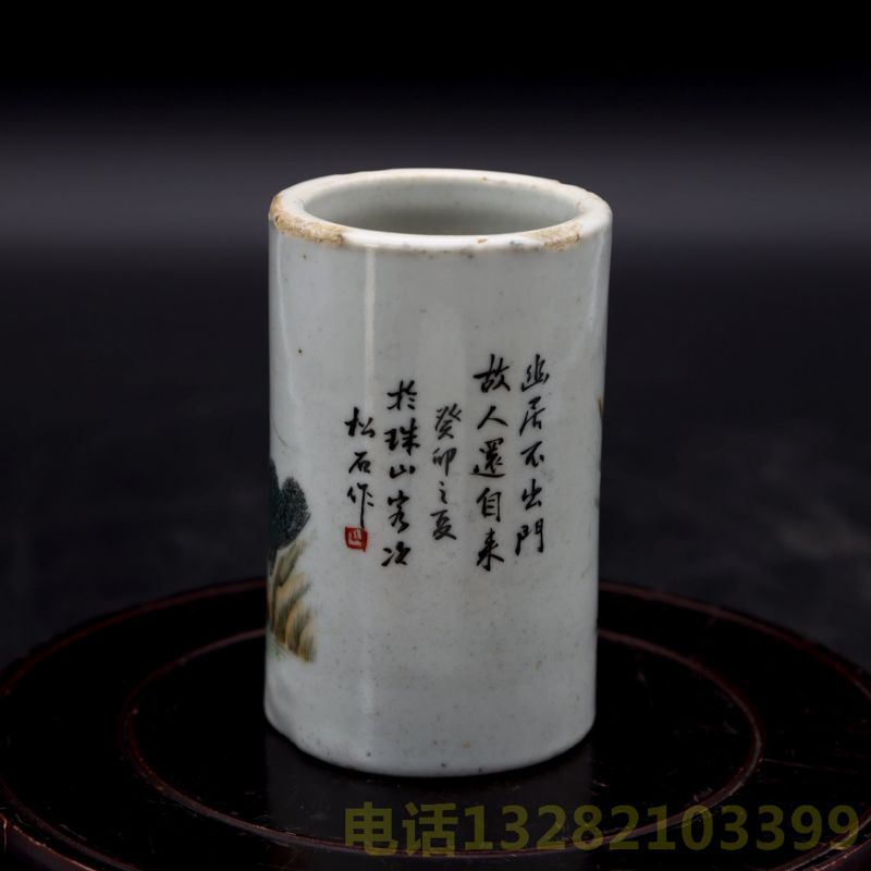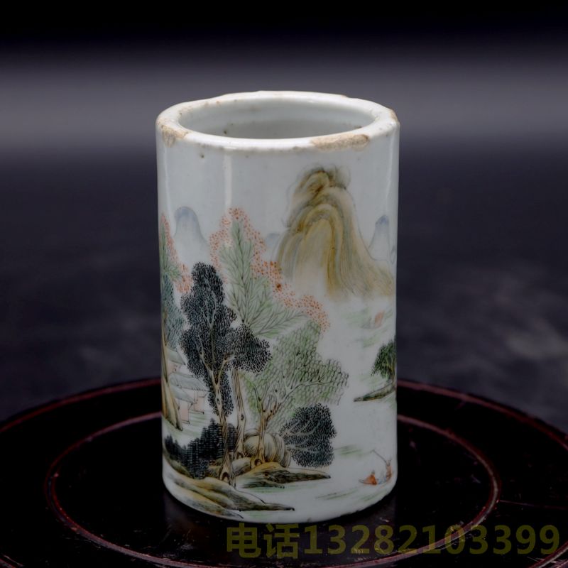 清代浅降彩山水诗文笔筒