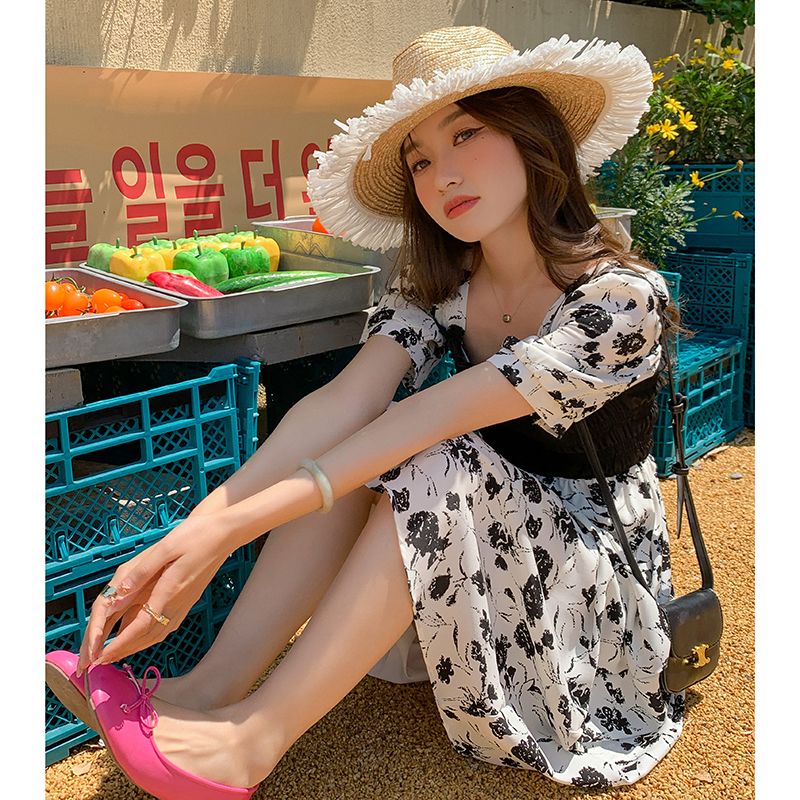 现货实拍2022夏季微胖MM法式木耳边方领玫瑰印花长款连衣裙 黑白色长款 S