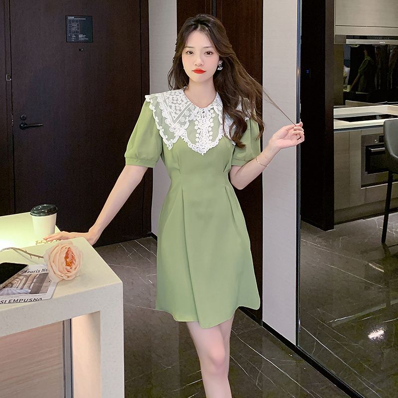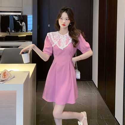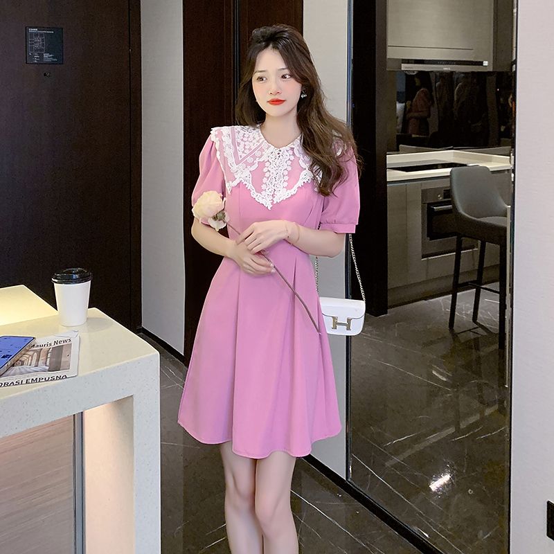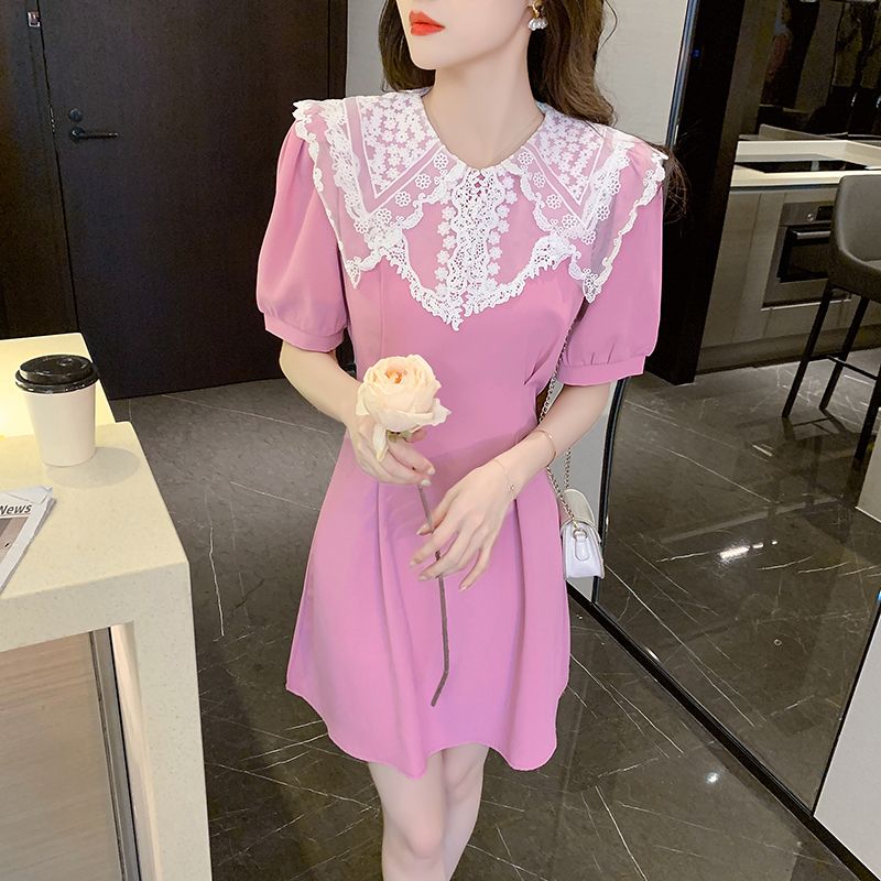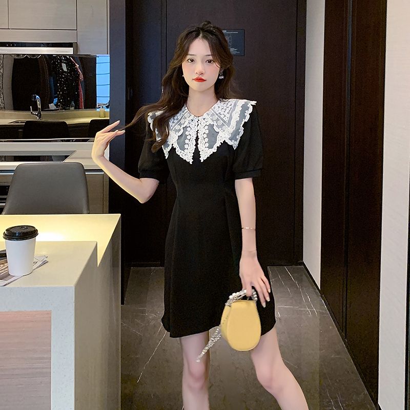 2022年新款蕾丝拼接娃娃领连衣裙女洋气宽松韩版a字裙子 黑色 S