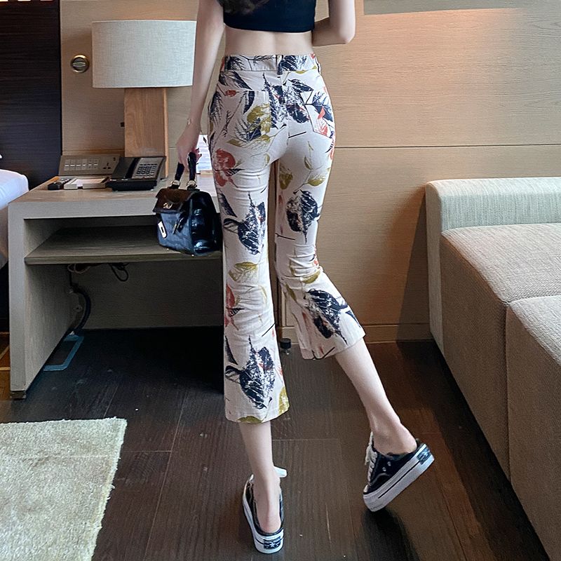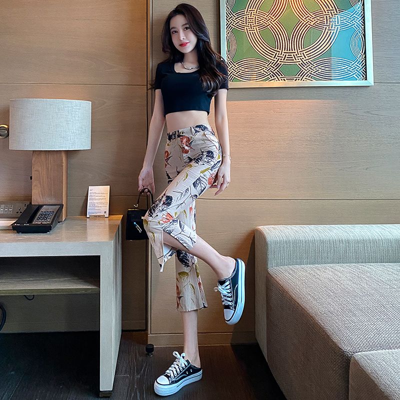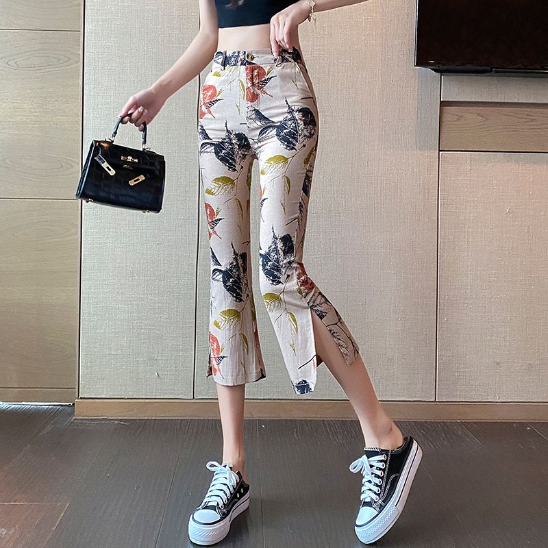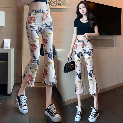 2022夏季实拍新款花色开叉休闲裤子女高腰显瘦八分微喇叭小个子裤 花色 S