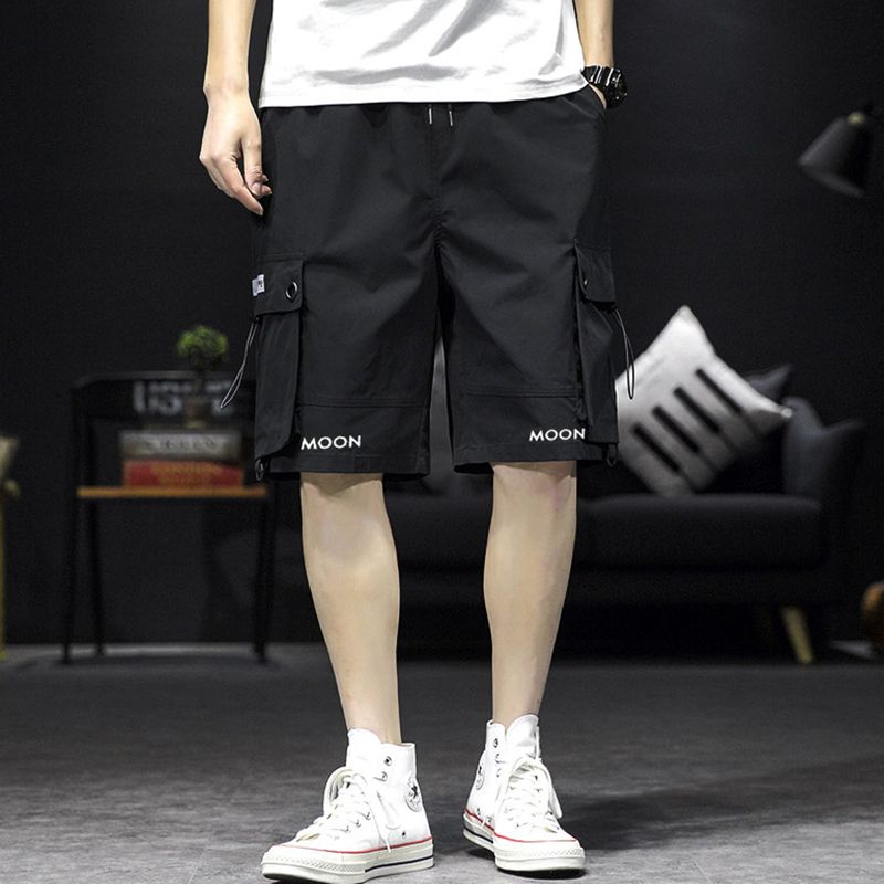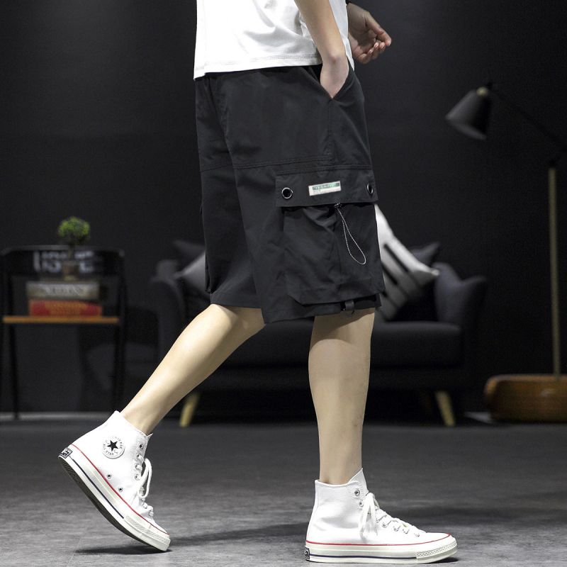 夏季超薄款5分冰丝裤子男韩版潮流工装休闲短裤男宽松五分裤男裤 黑色 35码