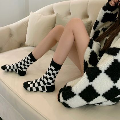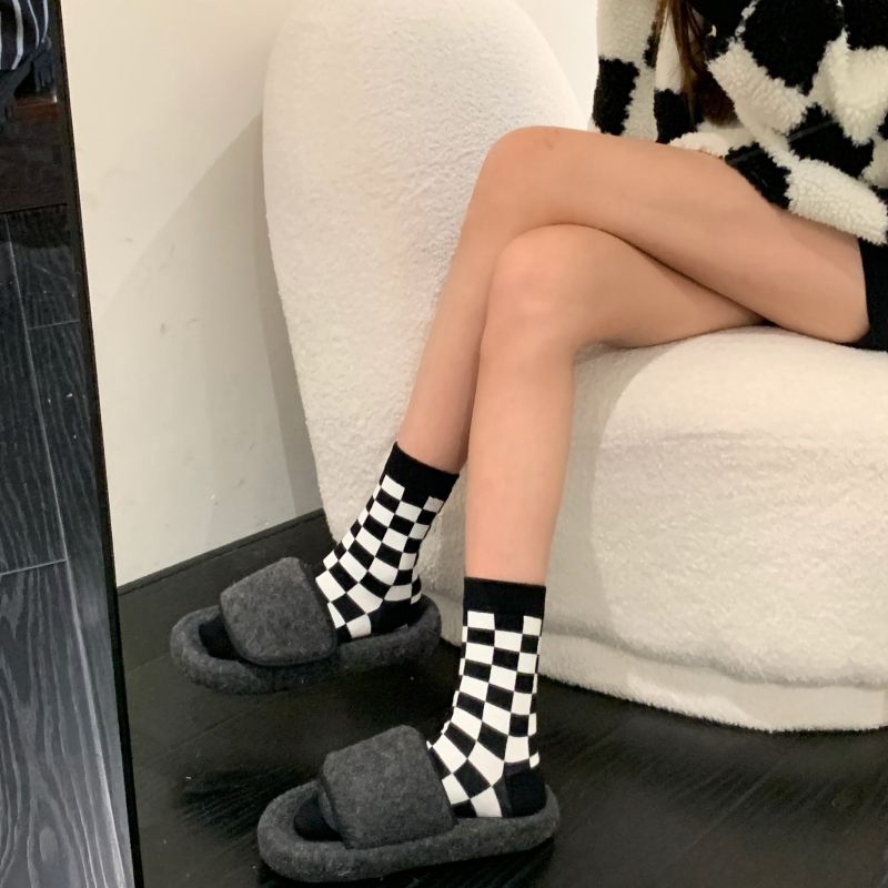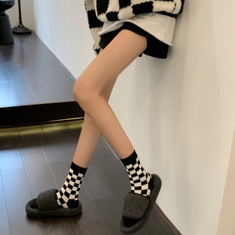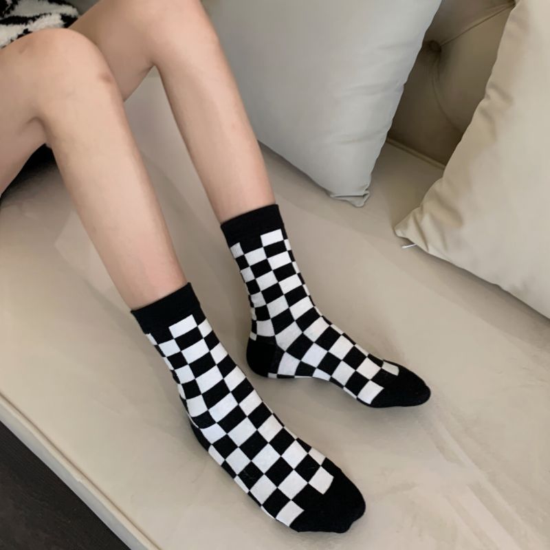 黑白棋盘格袜子女中筒秋冬ins潮方格袜 图色 均码